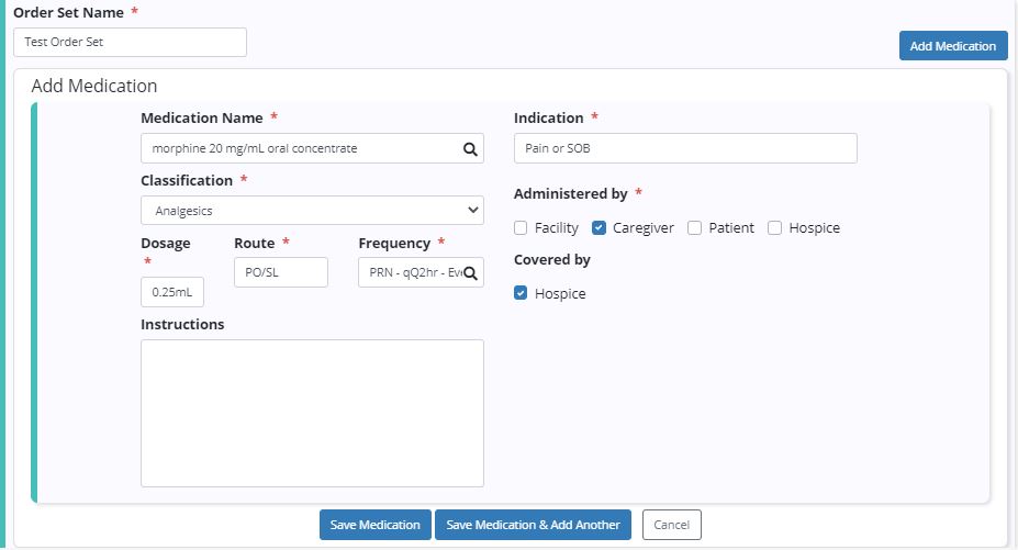 Enter the medication details and click Save Medication to add the medication to the order set, or click Save Medication & Add Another to add the medication and begin adding the next medication in the set.