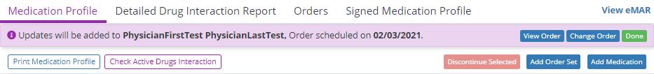 In the patient’s medication profile, click Update Medications to select or create a physician order for the new medications. Click Add Order Set to add a medication order set to the patient’s profile.