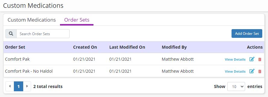 In the Custom Medications window, navigate to the Order Sets tab. A list of order sets that have been added for the organization will appear, with details about when each order set was created and last modified. To add a new order set to the list, click Add Order Set.