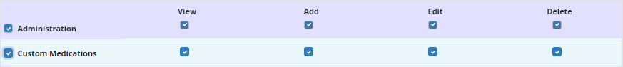 To give a user permission to document custom medications, edit the user’s profile and navigate to the Permissions tab. In the Administration section, select View, Add, Edit and Delete next to the Custom Medications permission. Click Save to finish granting the permissions to the user.