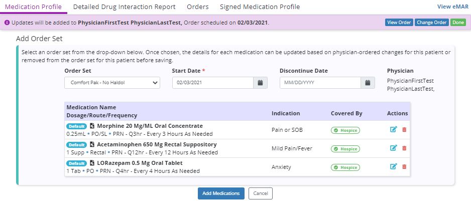 Once an order set is selected from the Order Set menu, a list of medications in the order set will appear. Users can edit or delete medications before adding them to the patient’s profile, based on any specifications given by the physician. Click Add Medications to add the list of medications to the patient’s medication profile.