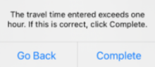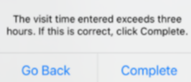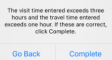 Select Go Back to return and correct the visit/travel time or Complete to complete the note as is.