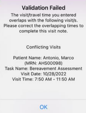 When the Conflicting Visit Time Validations feature is enabled in Company Setup on the web, users will be prevented from completing a visit when the visit or travel time overlaps with another visit on the clinician’s schedule.