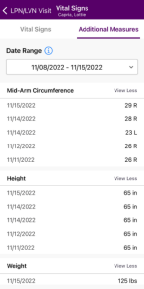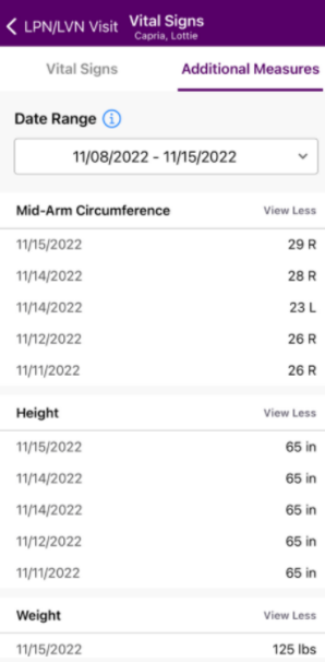 Additional measurements older than 14 days cannot be viewed on the mobile app. To view additional measurements older than 14 days, log in to Axxess Hospice on the web.