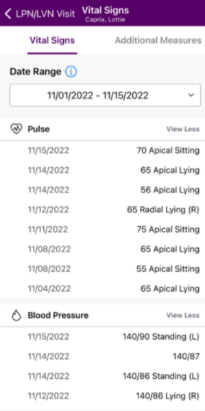 Vital signs older than 14 days cannot be viewed on the mobile app. To view vital signs older than 14 days, log in to Axxess Hospice on the web.