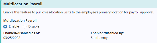 When multilocation payroll is enabled, users can pull cross-location visits to the employee’s primary location for payroll approval.