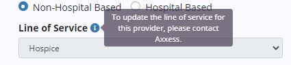 To update a provider’s line of service, users must contact Axxess. The workflow in Axxess Hospice will be adjusted based on the line of service selected for the provider.