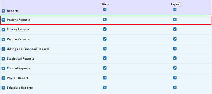 People tab ➜ People Center ➜ Edit ➜ Permissions tab ➜ Reports section ➜ Patient Reports ➜ View/Export ➜ Save