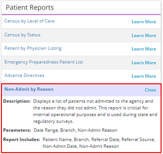 To view the Non-Admit by Reason Report, navigate to the Report Center under the Reports tab. In the Patient Reports section, select Learn More to view a description of the report, the report parameters and the information included in the report.