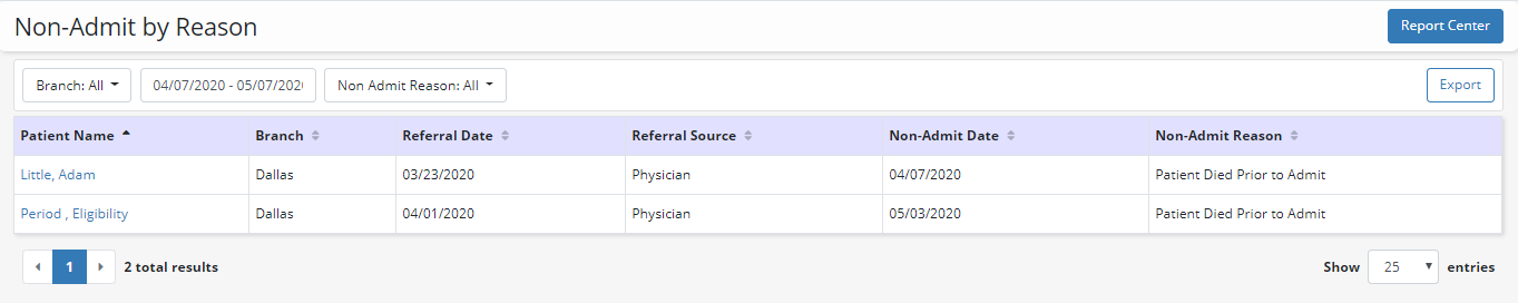 Select the report title to open the report in a new browser tab. Use the menus at the top of the screen to filter by branch, date range and/or non-admit reason. Click a column header to sort the report information by the information in that column. Select Export at the top of the screen to download a copy of the report in Excel format.