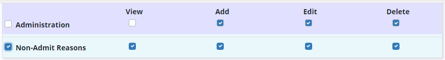 To give a user permission to manage reasons on the Non-Admit Reasons list, navigate to the People Center and select Edit to edit the user’s profile. On the Permissions tab, navigate to the Administration section and select View, Add, Edit and Delete next to the Non-Admit Reasons permission. Click Save to finish granting the permissions to the user.