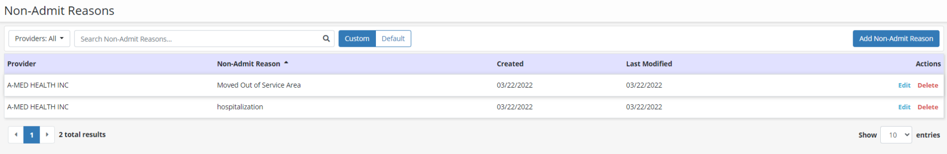 At the top of the list, users can toggle between the Default and Custom views and search for non-admit reasons using the search bar.