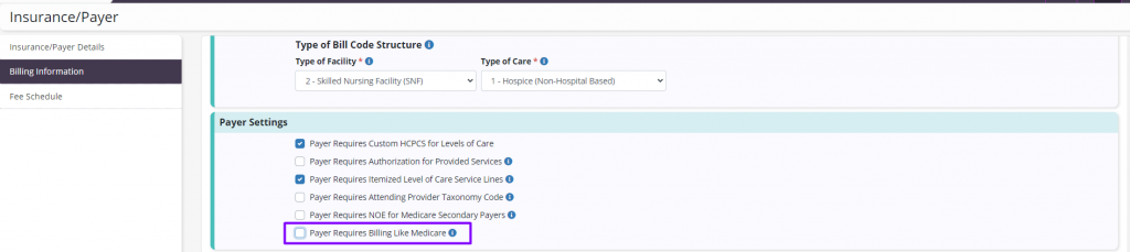 On the Billing Information tab, select Payer Requires Billing Like Medicare under Payer Settings. Only payers with Institutional (UB-04) listed as the bill type will prompt the option to appear.