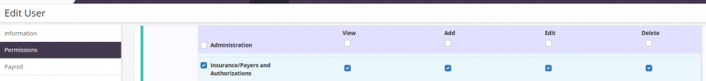 To give a user permission to view, add, edit and delete insurances/payers, edit the user’s profile and navigate to the Permissions tab. In the Administration section, select View, Add, Edit and Delete next to the Insurance/Payers and Authorizations permission. Click Save to finish granting the permissions to the user.