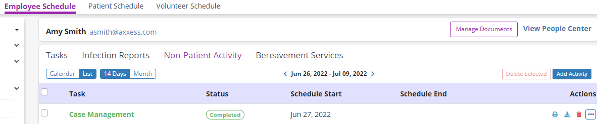 To edit task details for a non-patient activity, navigate to the Schedule tab and select Employee Schedule. Navigate to the appropriate employee and select the List view. Click the three-dot icon under Actions and select Task Details.
