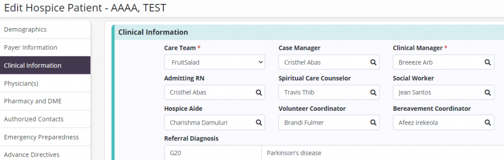 To assign users to a patient’s care team, navigate to the patient’s chart and select Edit Profile. On the Clinical Information tab, begin typing in the following fields to search for and assign users to the corresponding roles: