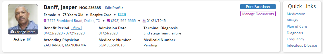 | Patient Status | The patient’s status in Axxess Hospice appears under the patient photo. For patients in Non-Admitted or Discharged status, the reason for non-admission/discharge appears next to the status. To change the patient’s status, select the blue edit icon. | ||
