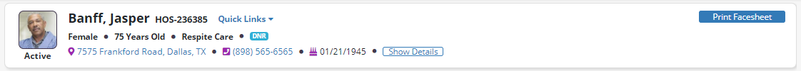 | Patient Status | The patient’s status in Axxess Hospice appears under the patient photo. For patients in Non-Admitted or Discharged status, the reason for non-admission/discharge appears next to the status. | ||