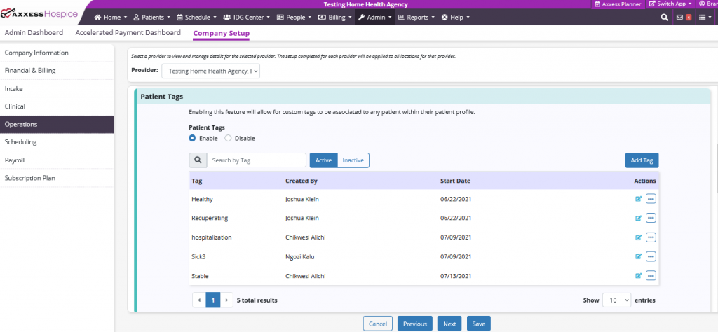 To enable the patient tags feature, navigate to Company Setup under the Admin tab. On the Operations tab, select Enable under Patient Tags.