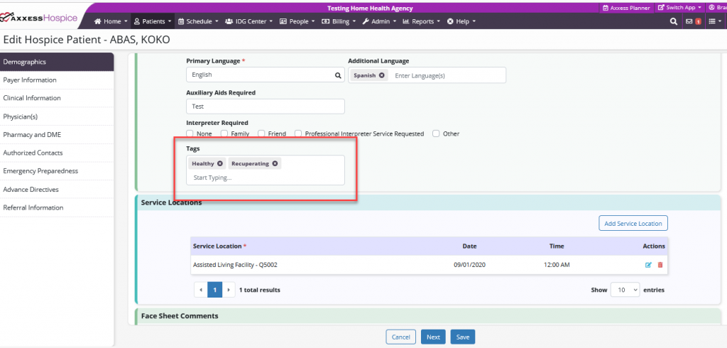 Axxess Hospice now enables users to add and assign patient tags to categorize patients that fall into certain groups. This functionality enables organizations to easily track and monitor various items at the patient level.