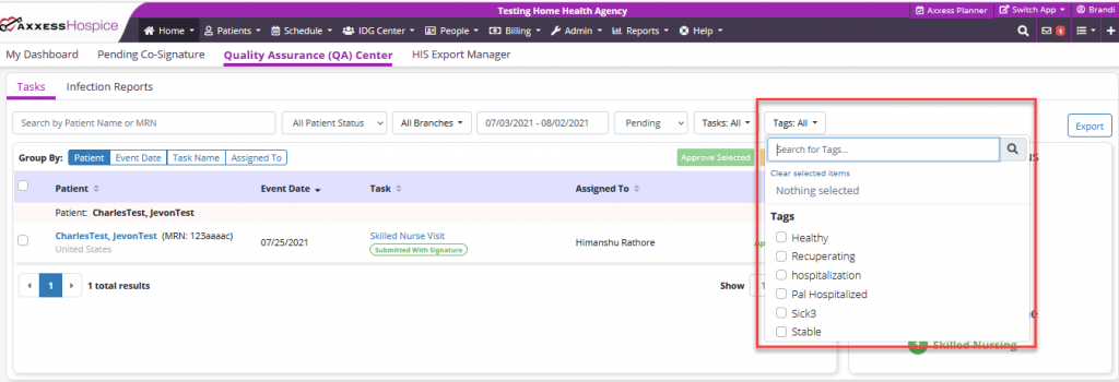 A Tags filter now appears in the Quality Assurance Center and on several reports in Axxess Hospice. The Tags filter provides the list of tags entered in Company Setup.