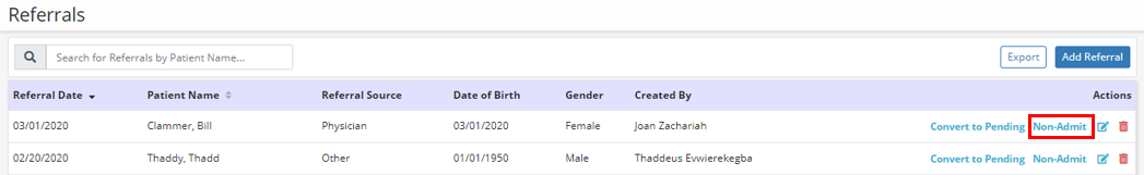 To update a referral to a non-admit, navigate to the Referrals list under the lists menu or Patients tab. On the Referrals screen, select Non-Admit under Actions to update the patient’s status to Non-Admitted.