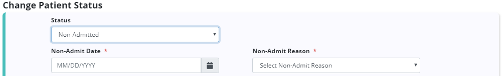 To view patients in Non-Admitted status, navigate to the Patient Charts from the Patients tab and select Non-Admitted from the Status filter. To view the Non-Admit by Reason report, navigate to the Report Center under the Reports tab. In the Patient Reports section, select Non-Admit by Reason.