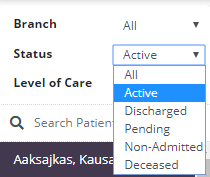 To mark an active patient as discharged, navigate to the Patient Charts from the Patients tab and select Active in the Status filter.