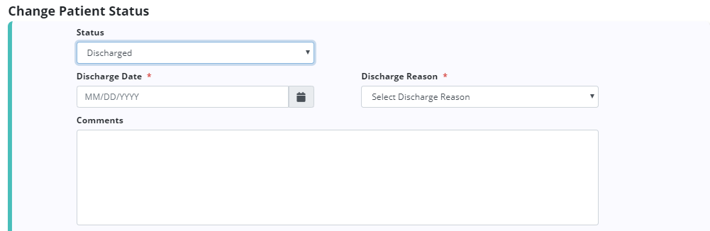 Select Discharged and document the discharge date and discharge reason. Enter any comments as needed.