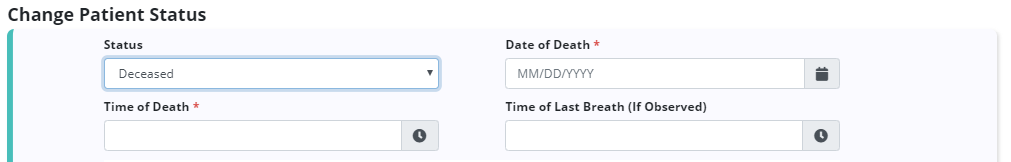 Select Deceased and document the date of death, time of death, and time of last breath.