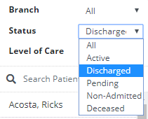 Patients who have been discharged from an agency can now be readmitted. To readmit a discharged patient, navigate to the Patient Charts under the Patients tab and select Discharged from the Status filter.