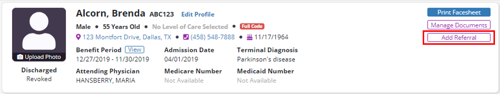 The patient’s previously documented information will automatically populate in the Referral window. Verify the existing information for accuracy and enter the patient’s updated information. A new referral date and admission information are required.