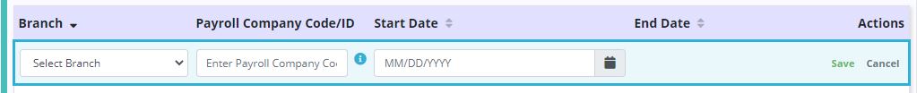 Click Add Branch to associate a payroll company code/ID to the payroll branches within your organization. Select the branch, enter the payroll company code/ID (provided by your payroll vendor) and enter the start date.