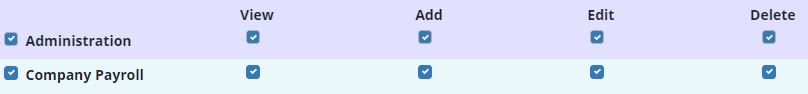 To give a user permission to view, add and edit company payroll, edit the user’s profile and navigate to the Permissions tab. In the Administration section, select View, Add and Edit next to the Company Payroll permission. Click Save to finish granting the permissions to the user.