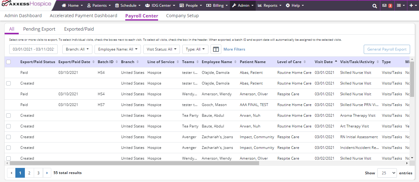 Axxess Hospice now provides a robust Payroll Center that enables users to generate payroll export files with the data elements and formatting required by the organization’s payroll vendor.