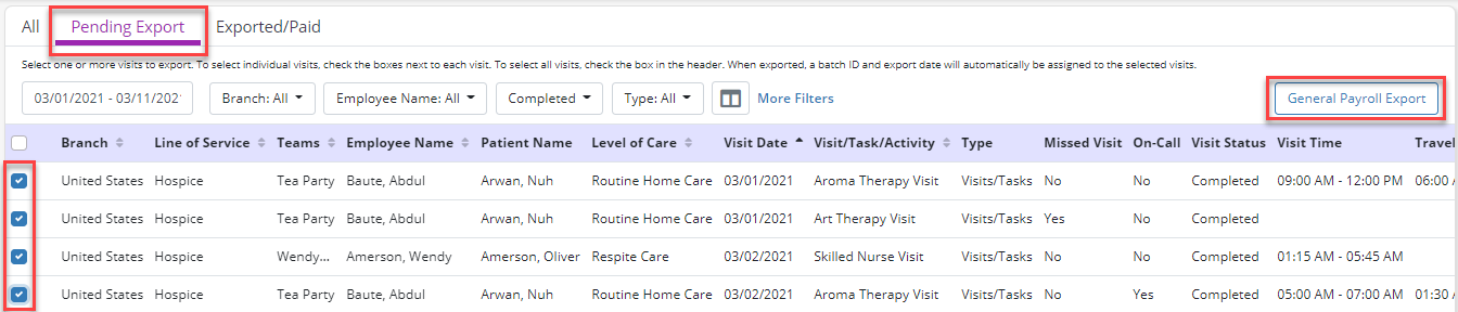 Users can export visits and non-patient activities from the All and Pending Export tabs. To export visits or NPA tasks, check the boxes next to the visits/tasks you want to export and click General Payroll Export.