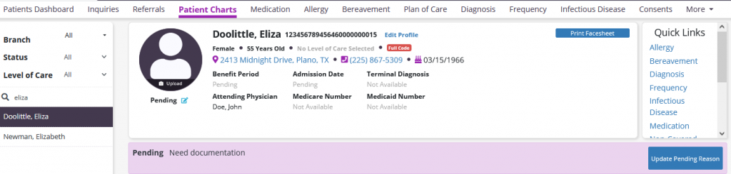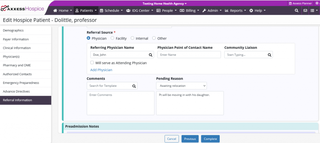Axxess Hospice now allows organizations to document the reason why a patient is in pending status. This feature enables organizations to easily track their patients and document details regarding the pending status prior to admission.
