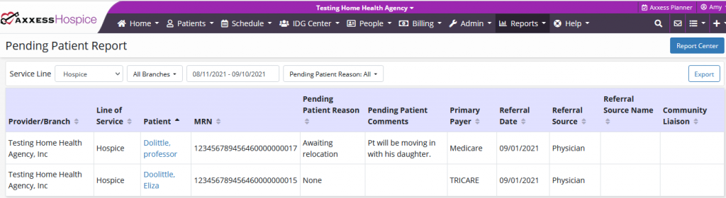 The Pending Patient Report allows the organization to generate a report of patients by date range and the reason they are pending. Users need permissions to access this feature. This report can be found in the report center under Patient Reports.