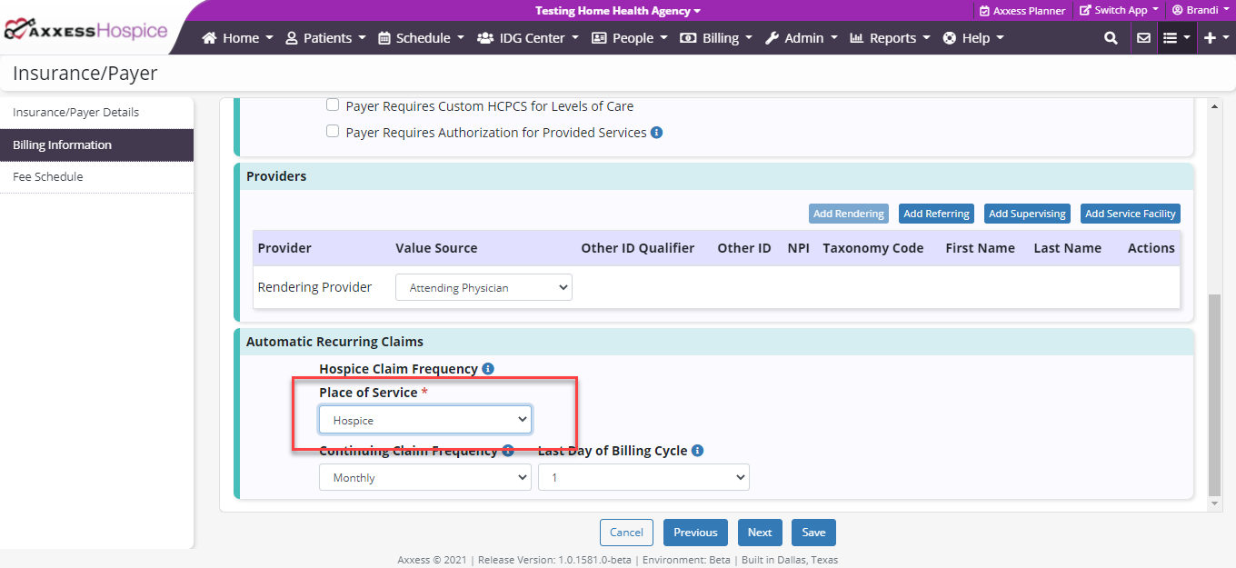 This field will default to the place of service selected on the Billing Information tab of the payer setup.