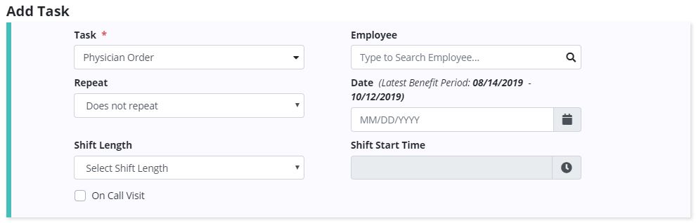 Schedule tab➜ Patient Schedule or Employee Schedule➜ Add Task➜ Physician Order in Task drop-down menu