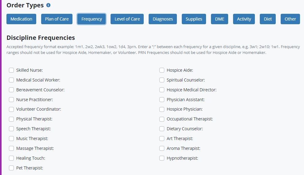 Visit frequencies are updated from the Physician Order to ensure that all discipline frequencies occur in a corresponding order. To update a visit frequency, select the Frequency button in the Physician Order.