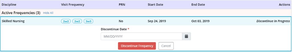 The patient’s frequency profile will display the discipline, visit frequency, PRN status, start date, and end date for each of the patient’s active and discontinued frequencies.