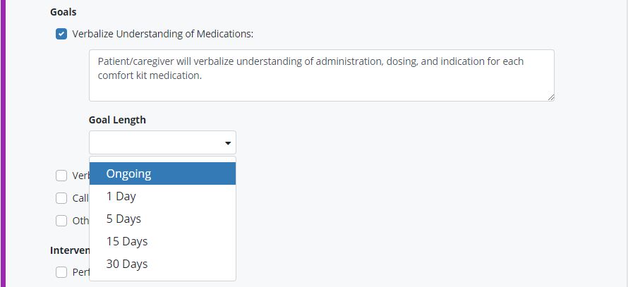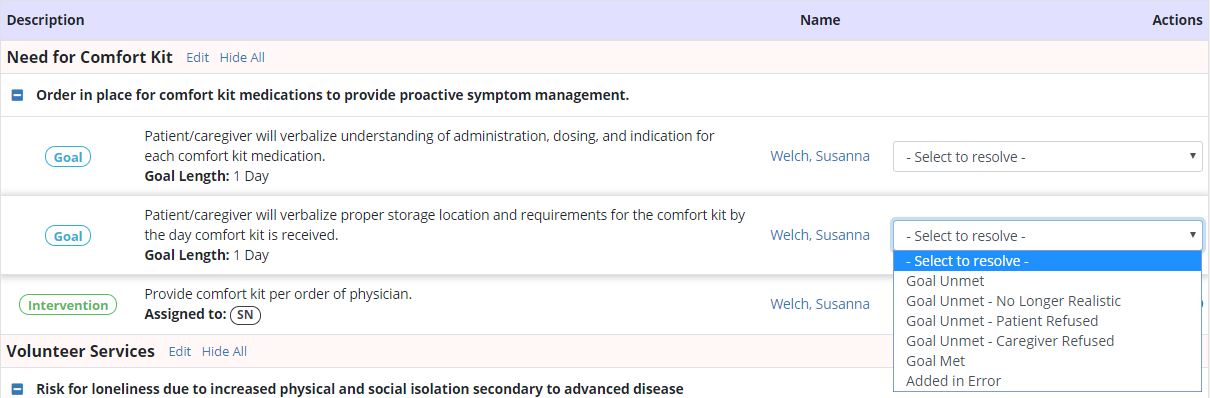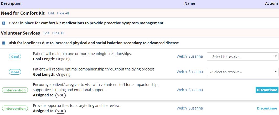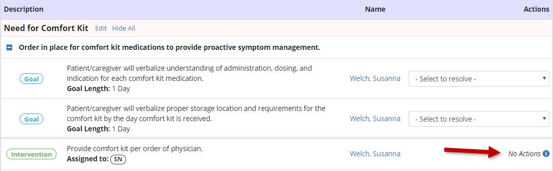 If there is only one intervention associated with a goal, you will not have the option to discontinue the intervention, since all goals require at least one intervention. No Actions will appear in the Actions column.