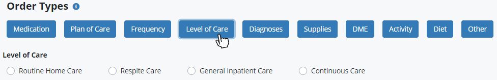The level of care can only be updated from the Physician Order. To update the level of care, select the Level of Care button in the Physician Order and select the level of care you want to order for the patient.