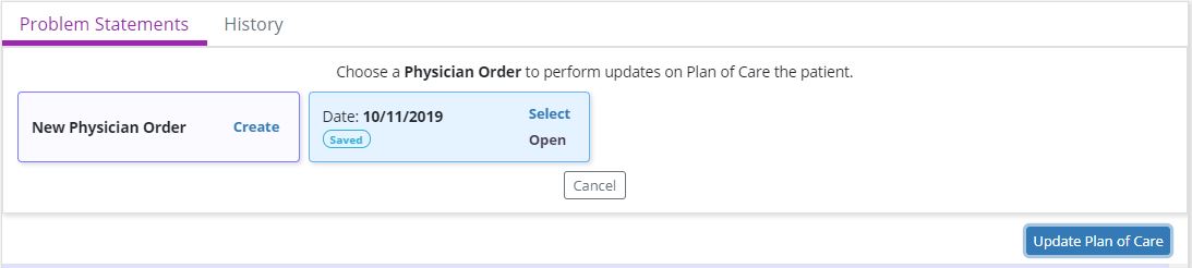 Once you select Update Plan of Care, you will be prompted to add a new Physician Order or use a Physician Order that is already open for the patient.