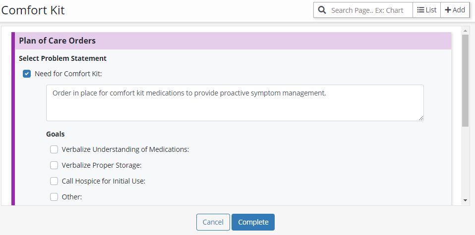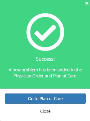 Once you have entered the problem statement, goals, and interventions for the problem area, click Complete at the bottom of the page. The problem statement, goals, and interventions will update in the Plan of Care Profile and flow to the Physician Order. A green success message will confirm that the problem was successfully added.