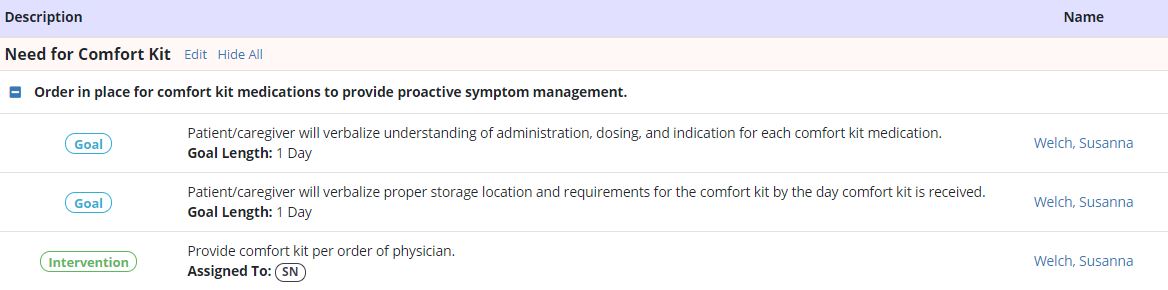 To add new goals and interventions to an existing problem area, select Edit next to the problem area description in the Plan of Care Profile.