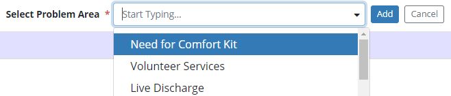 To add a problem area to the Plan of Care Profile, select Add Problem. Select a problem area from the Select Problem Area drop-down menu and click Add.