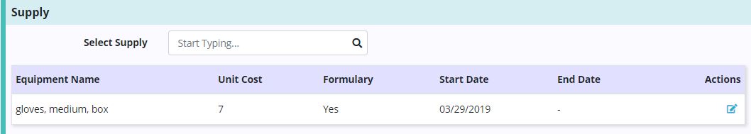 To discontinue a supply, click the edit icon under Actions in the patient’s profile. Enter an End Date and click Save.