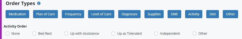 Activity orders can only be updated directly through a Physician Order document. Access the Physician Order by clicking the Add Orders button in the Plan of Care Review section of a clinical document, or by scheduling a Physician Order in the Schedule Center. In the Physician Order, select the Activity button under Order Types.